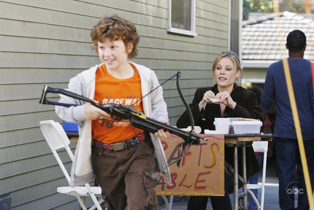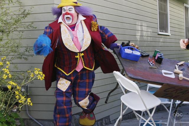 This use of time jumping is effective in “Fizbo” because the viewer is given double duties. First, we are watching the episode’s narrative — about Luke’s over the top birthday party (a moon bounce! a reptile lady! a clown!) — unfold. But we are also searching for the cause of the horrible accident. As a result, every new element introduced to the story becomes a suspect: Jay gives Luke a crossbow as a present, a zipline running through the middle of the party seems destined to cause a concussion for some unlucky child, and one of the reptile lady’s poisonous scorpions is set loose by a jealous Haley (Sarah Hyland). Without the time jumping narrative structure the series of bizarre events occurring at Luke’s birthday party would be just that — bizarre. But knowing that one of these dangers will be the cause of the hospital visit we witnessed at the beginning of the episode serves to tie these disparate elements together. In fact, the more bizarre the element (i.e., the crossbow), the funnier the episode becomes.