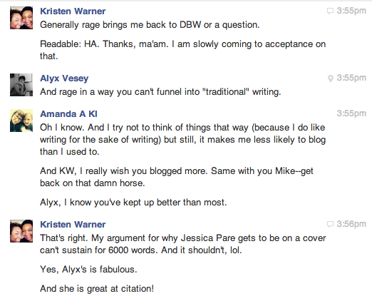 I had a chat, via Facebook message, with three fellow aca-bloggers — the aformentioned Michael Newman, Kristen Warner of Dear Black Woman, and Alyx Vesey, of Feminist Music Geek — to get some answers. I’ve pasted our discussion below:
