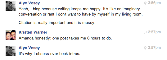 And collectively, I believe that scholarly blogs emphasize some of the best things about the profession: community, conversation, connection, an openness to evolving thought and response, links between our individual perspectives and knowledges and broader issues, and more.