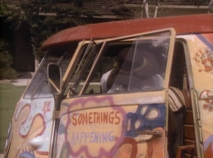 If you are unfamiliar with this program for some reason, The Wonder Years was a 30 minute comedy/drama that ran on ABC from 1988-1993. The series opens in 1968, when protagonist Kevin Arnold (Fred Savage) is starting junior high. Throughout the series Kevin’s personal coming-of-age story runs parallel with America’s very different, public coming-of-age story. As Kevin becomes more of an adult, America is also coming to terms with a new kind of adulthood: Vietnam, 2nd wave feminism, the Black Power movement, hippies, free love, a man on the moon, you get the picture. In episode 4, “Angel,” Kevin’s older sister, Karen (Olivia D’Abo), introduces the family to her radical boyfriend, Louis (played by a very young, very handsome John Corbett). Kevin takes an instant dislike to Louis because he makes out with his sister on his parents’ lawn (gross!) and because, as Kevin’s voice over explains: “I don’t know what it was about Louis that I didn’t like. Guess there was something about him I didn’t understand.” Here we catch a glimpse of Louis’ spray-painted VW van, with the words “Somethings Happening” scrawled on the door. To Kevin, those words were ciphers, shorthand for a movement that he was too young to comprehend. Louis and his leather vest and VW van were something, to use Kevin’s words “that [were]…taking my sister away from us.”